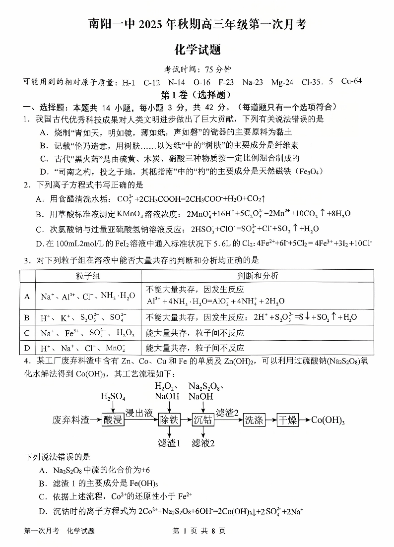 高三化学+答案--河南省南阳市第一中学2026届高三上学期第一次月考