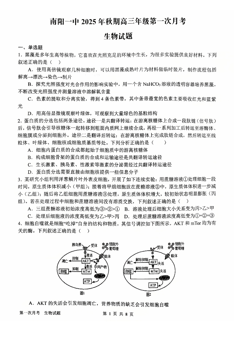 高三生物+答案--河南省南阳市第一中学2026届高三上学期第一次月考