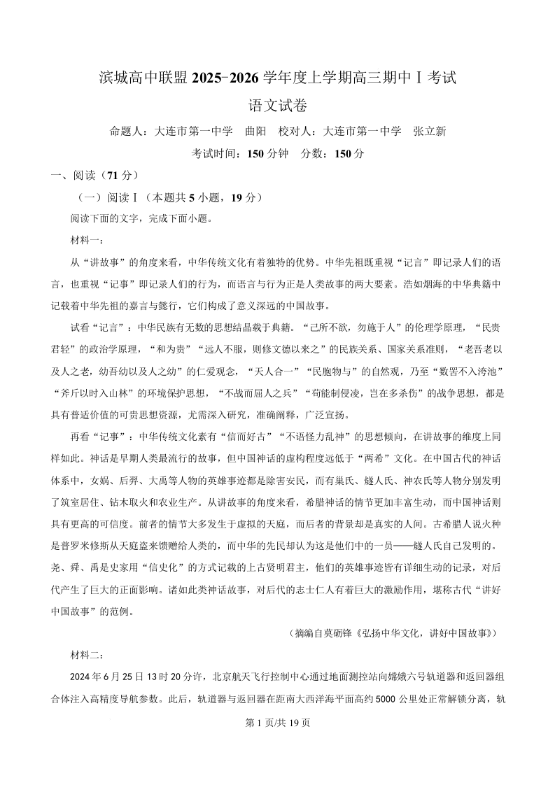 高三语文(解析版)--辽宁省大连市滨城高中联盟2026届高三上学期期中Ⅰ考试