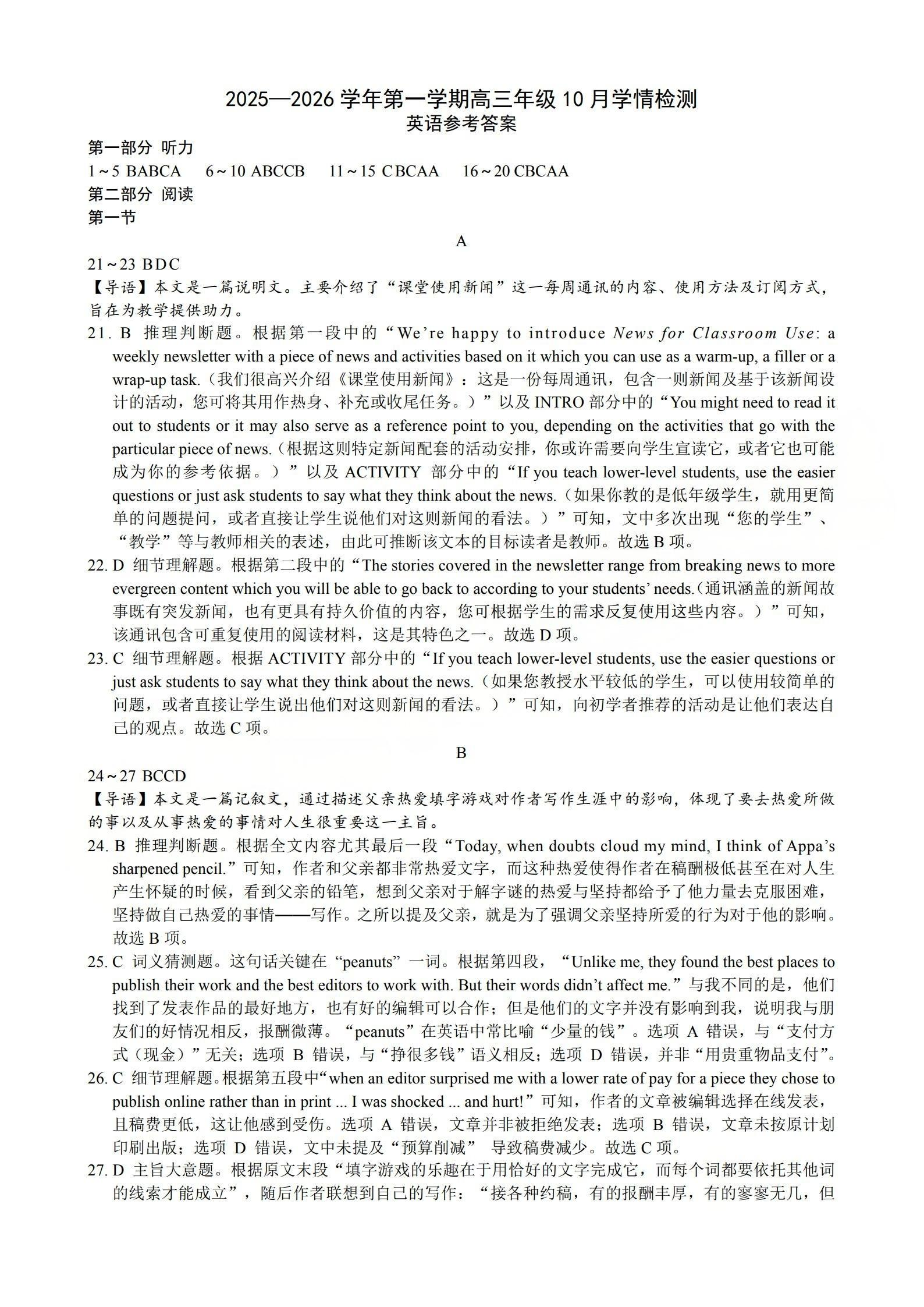 高三英语答案--山西省三重教育2026届第一学期高三年级10月学情检测