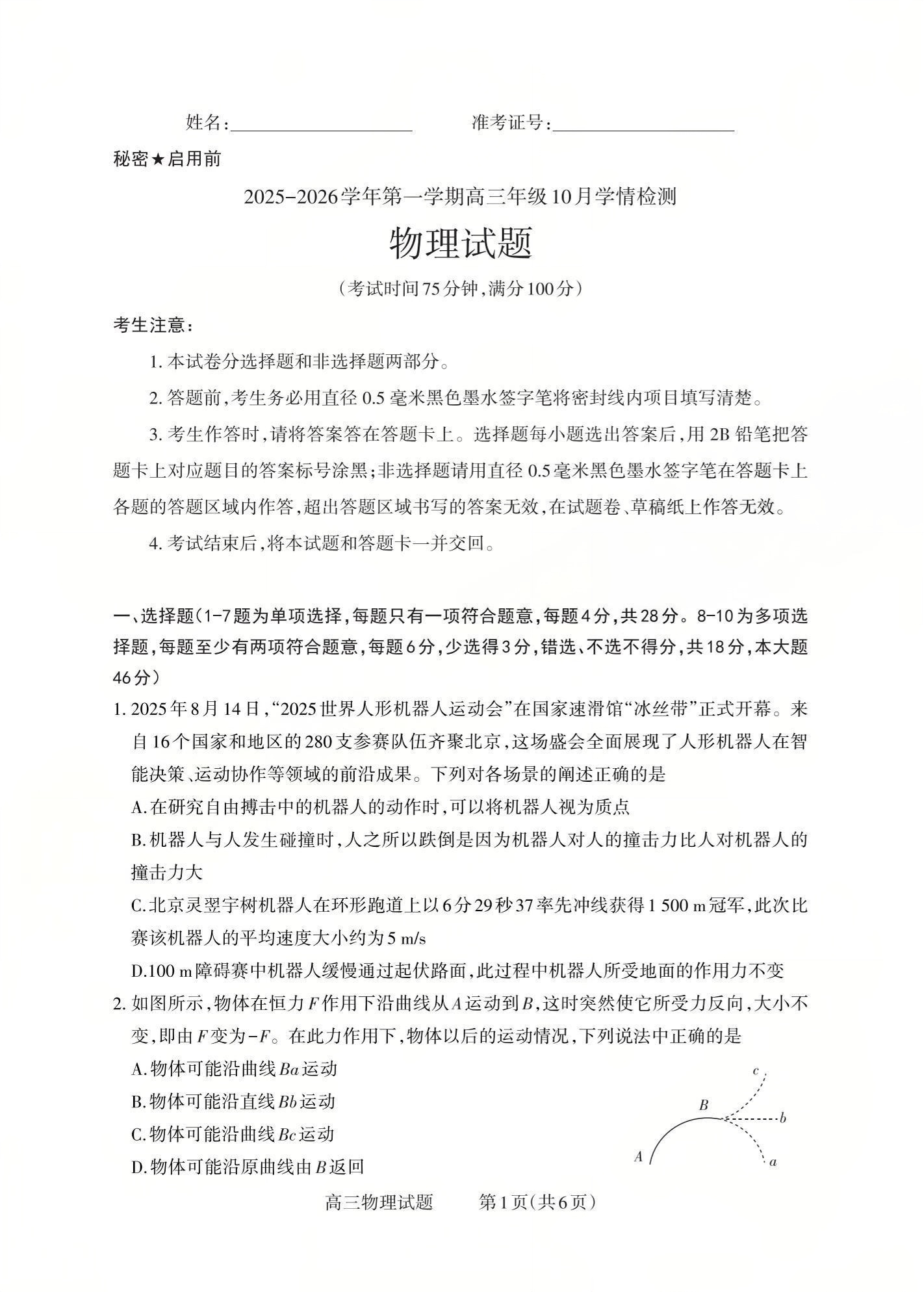 高三物理--山西省三重教育2026届第一学期高三年级10月学情检测