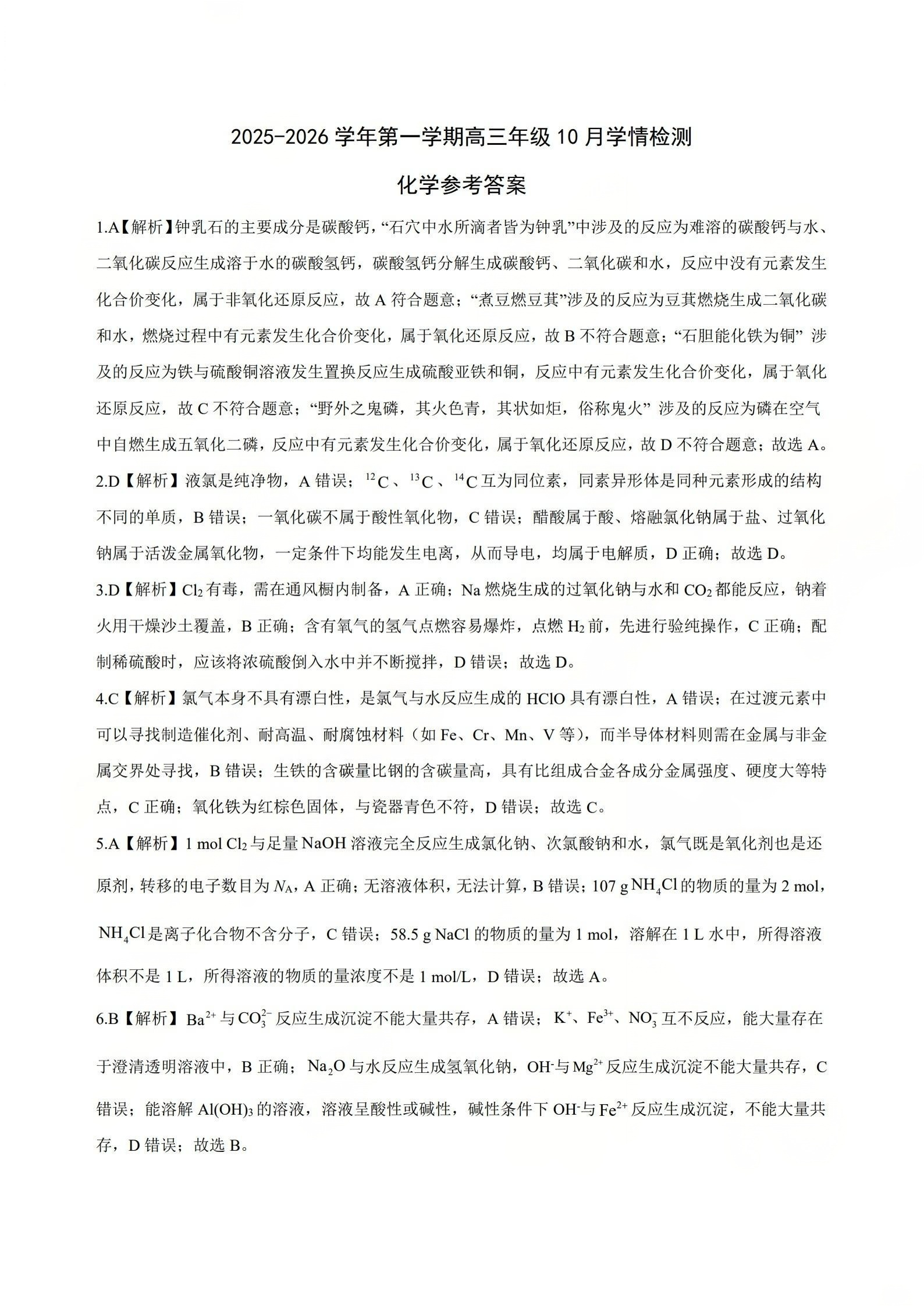 高三化学答案--山西省三重教育2026届第一学期高三年级10月学情检测