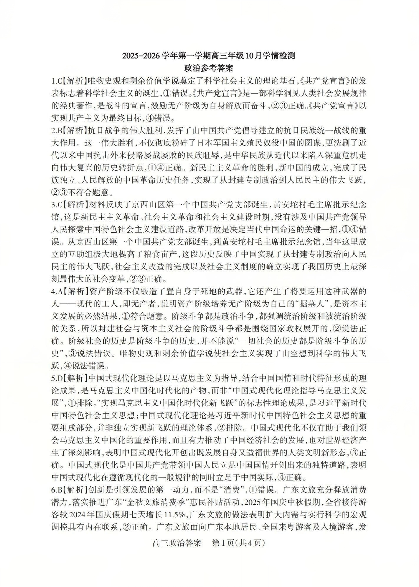高三政治答案--山西省三重教育2026届第一学期高三年级10月学情检测