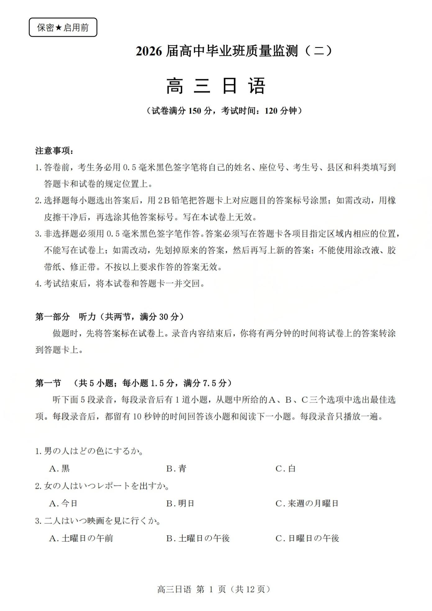 高三日语--山西省三重教育2026届第一学期高三年级10月学情检测