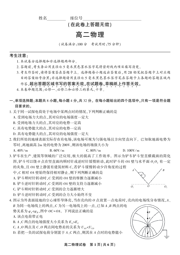 高二物理--安徽省皖江名校联盟2025-2026学年高二上学期10月阶段考