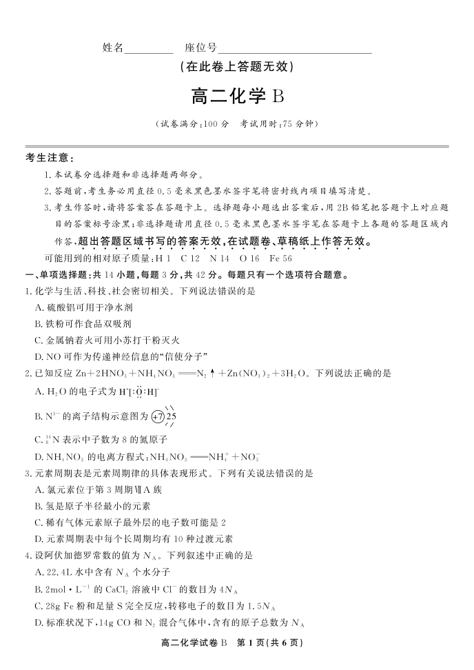 高二化学B--安徽省皖江名校联盟2025-2026学年高二上学期10月阶段考