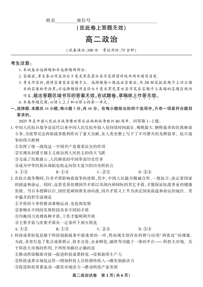 高二政治--安徽省皖江名校联盟2025-2026学年高二上学期10月阶段考