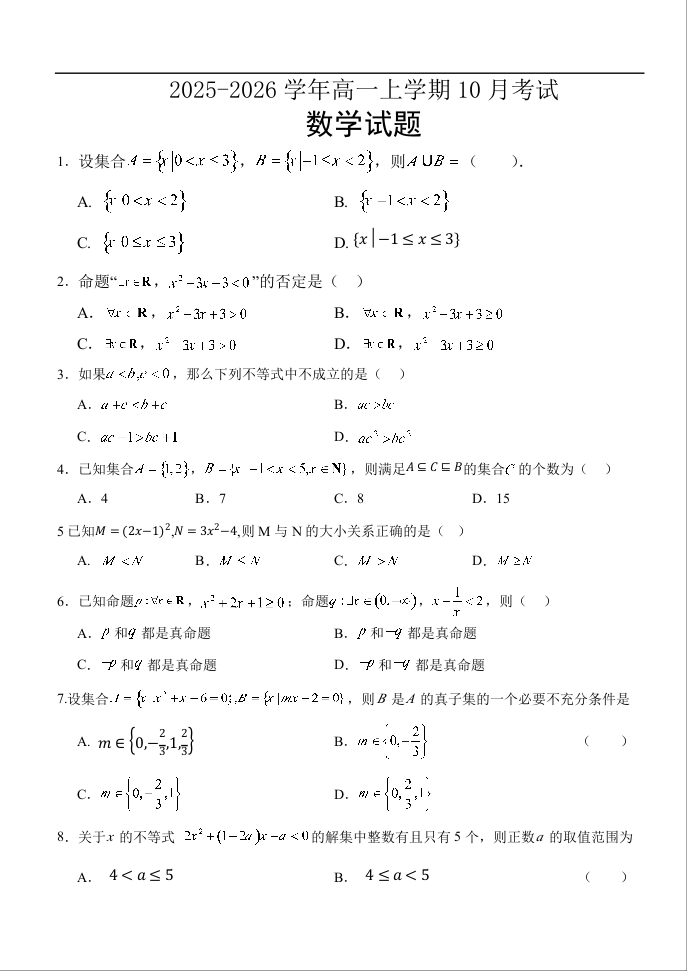 高一数学+答案--河北省保定市唐县第一中学2025-2026学年高一上学期10月月考