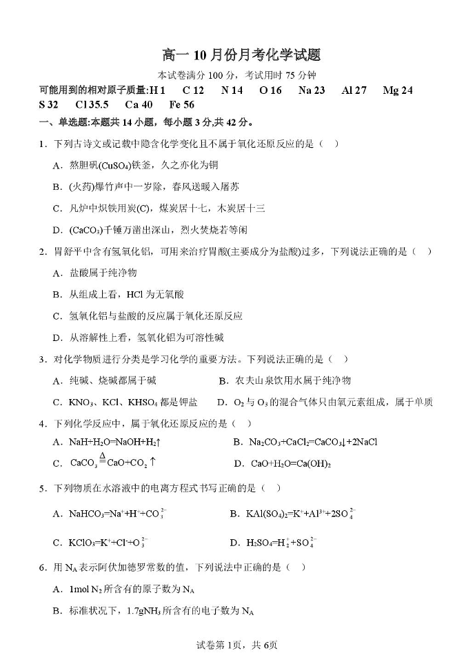 高一化学--河北省保定市唐县第一中学2025-2026学年高一上学期10月月考