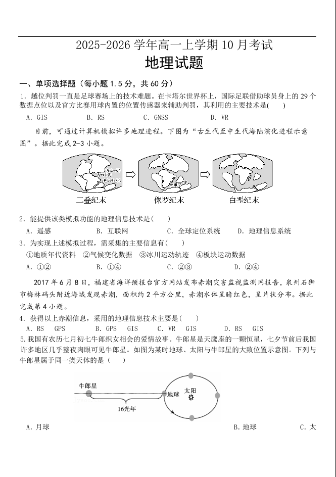 高一地理+答案--河北省保定市唐县第一中学2025-2026学年高一上学期10月月考
