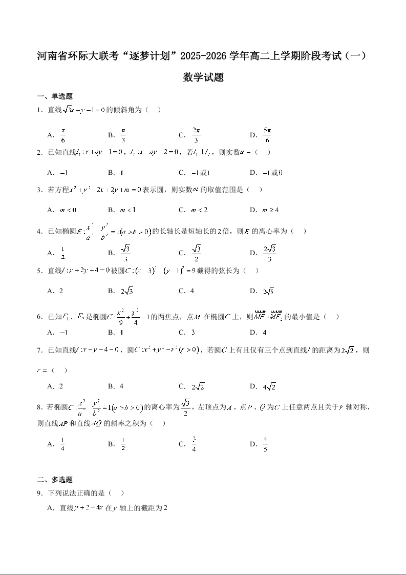高二数学+答案--河南省驻马店市“逐梦计划”环际大联考2025-2026学年高二上学期阶段考试(一)