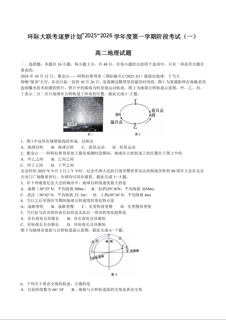 高二地理+答案--河南省驻马店市“逐梦计划”环际大联考2025-2026学年高二上学期阶段考试(一)