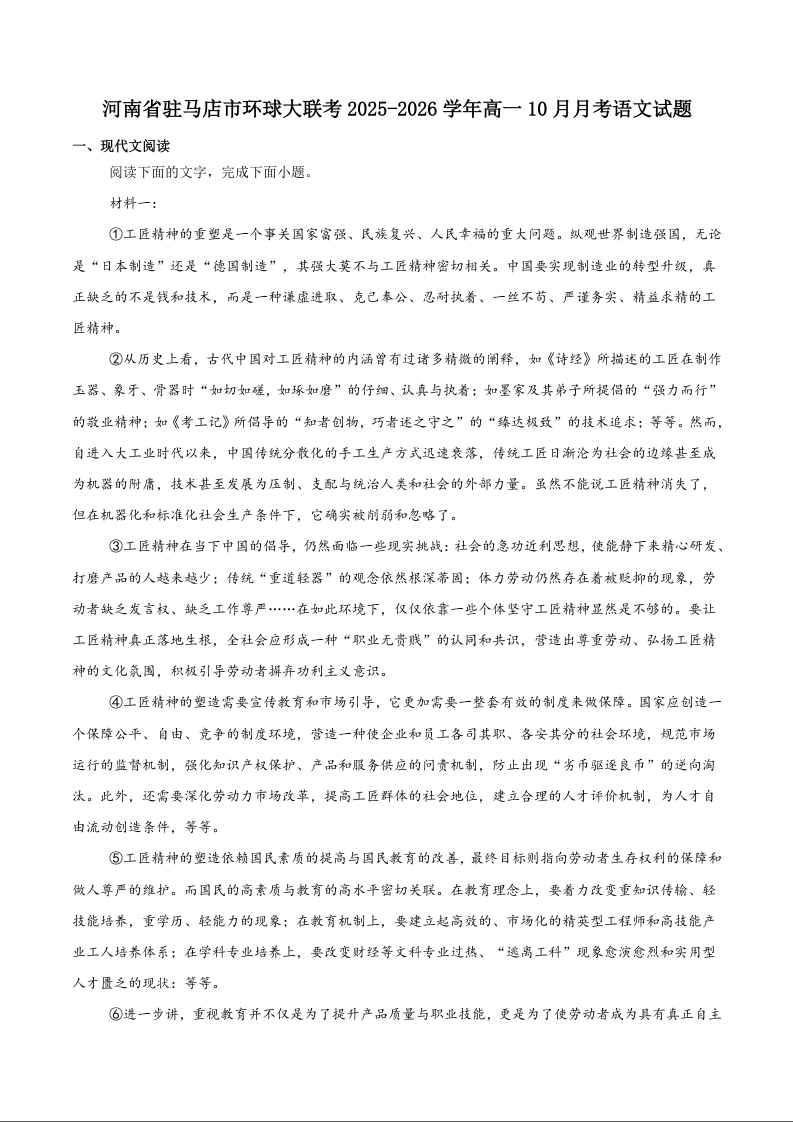 高一语文+答案--河南省驻马店市“逐梦计划”环际大联考2025-2026学年高一上学期阶段考试(一)