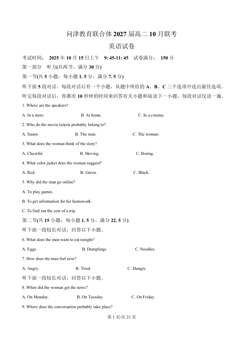 高二英语(解析版)--湖北省武汉市问津联盟2025-2026学年高二上学期10月联考