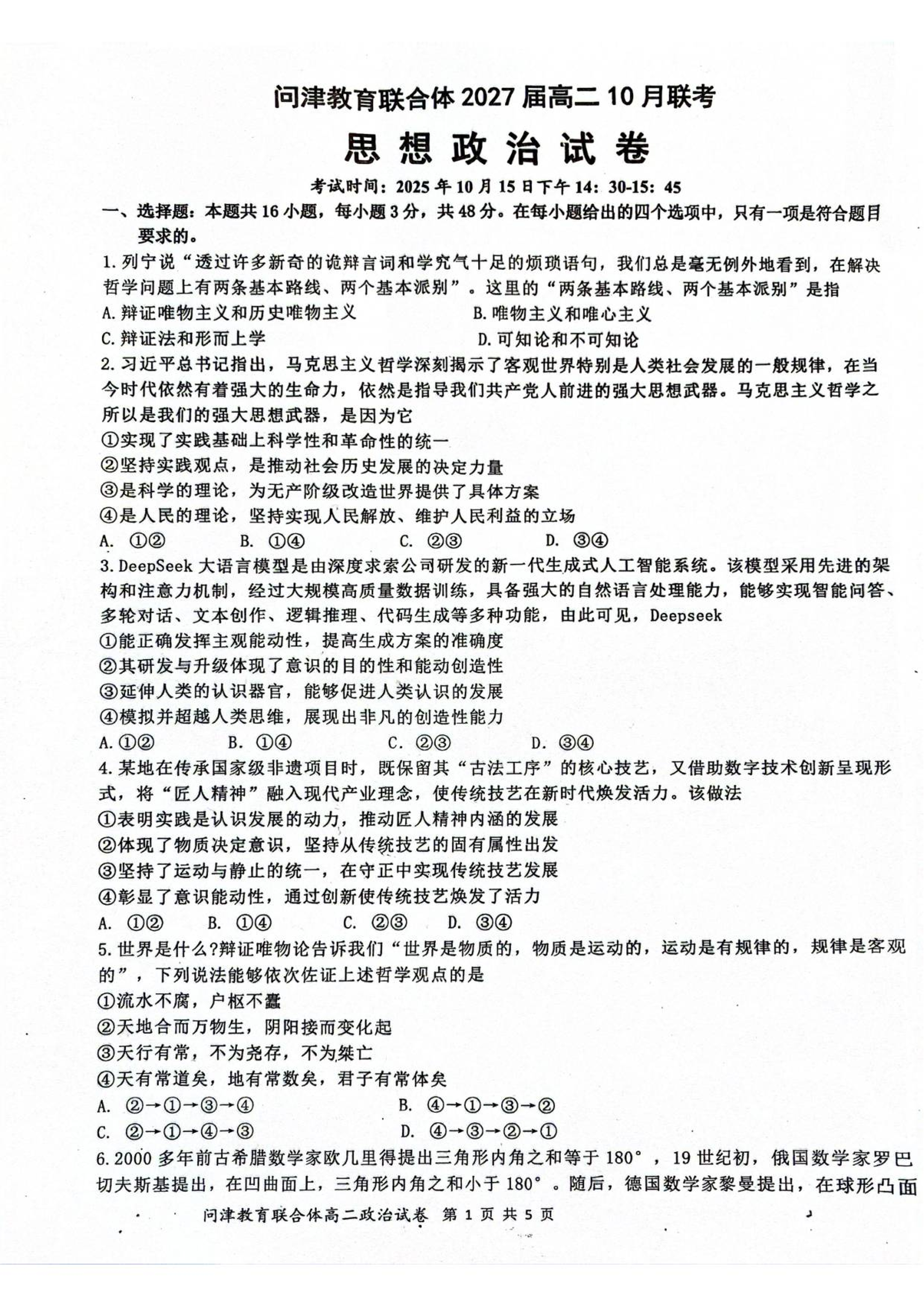 高二政治--湖北省武汉市问津联盟2025-2026学年高二上学期10月联考