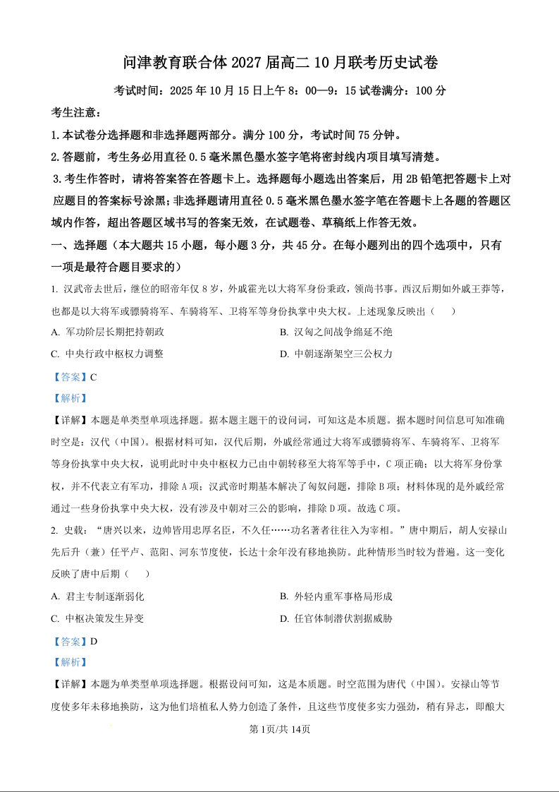 高二历史(精品解析版)--湖北省武汉市问津联盟2025-2026学年高二上学期10月联考
