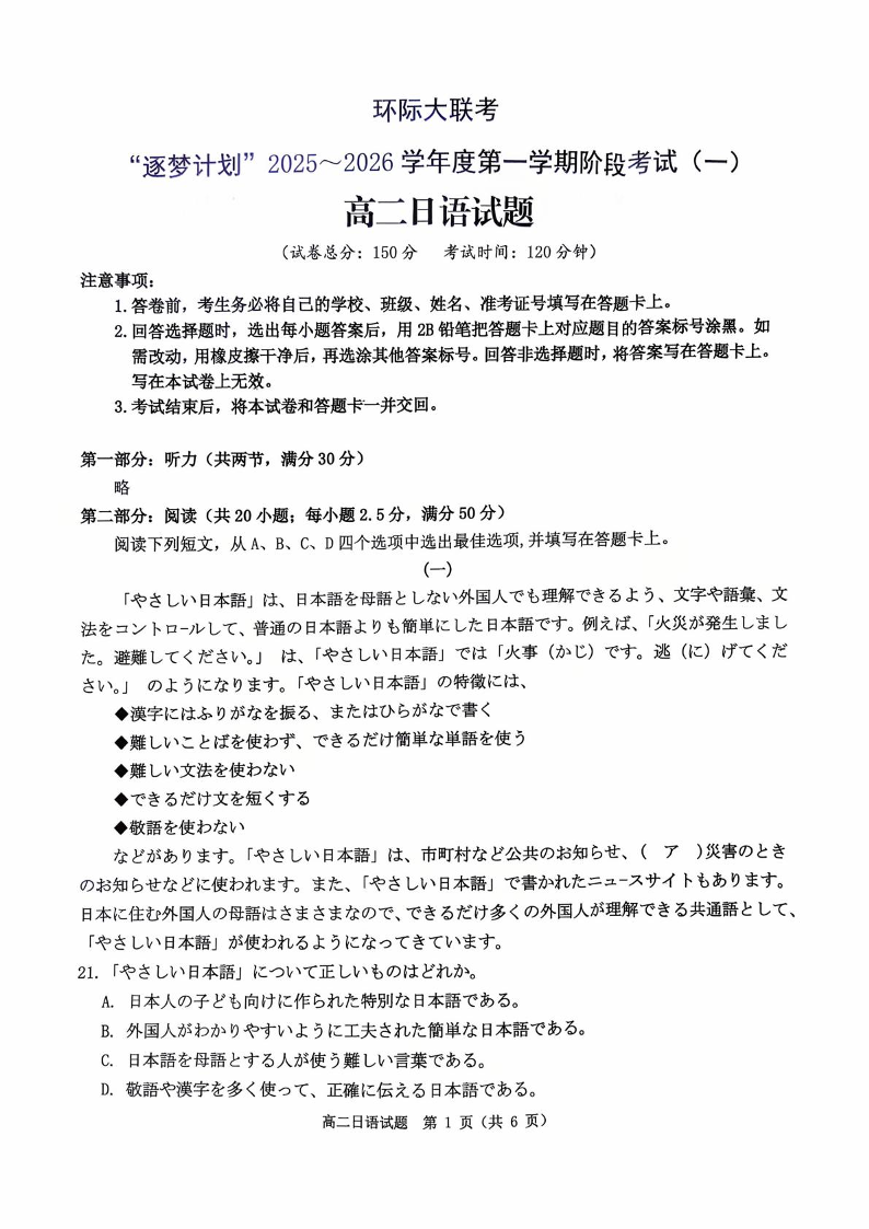 高二日语+答案--河南省驻马店市“逐梦计划”环际大联考2025-2026学年高二上学期阶段考试(一)
