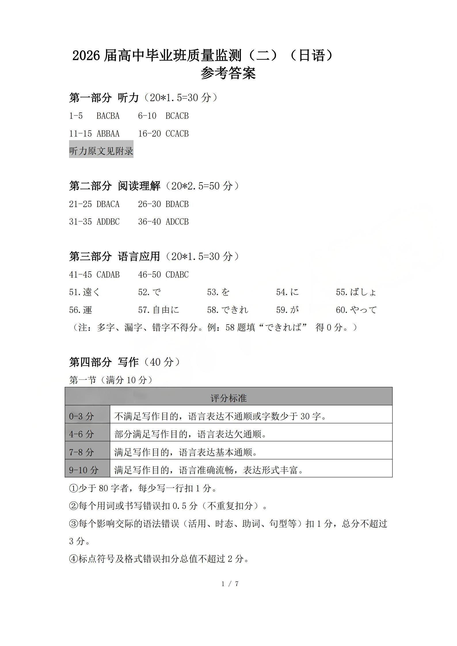 高三日语答案--山西省三重教育2026届第一学期高三年级10月学情检测