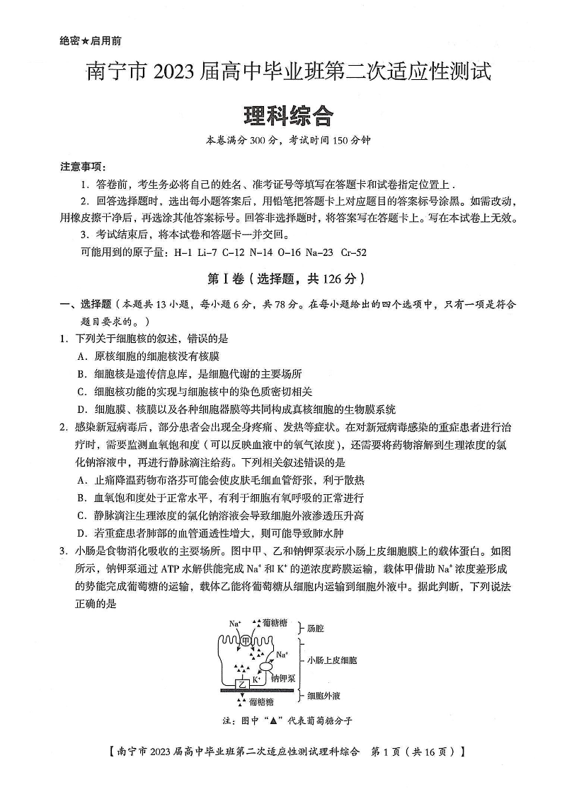 高三理综+答案--广西南宁市2023届高中毕业班第二次适应性测试(二模)