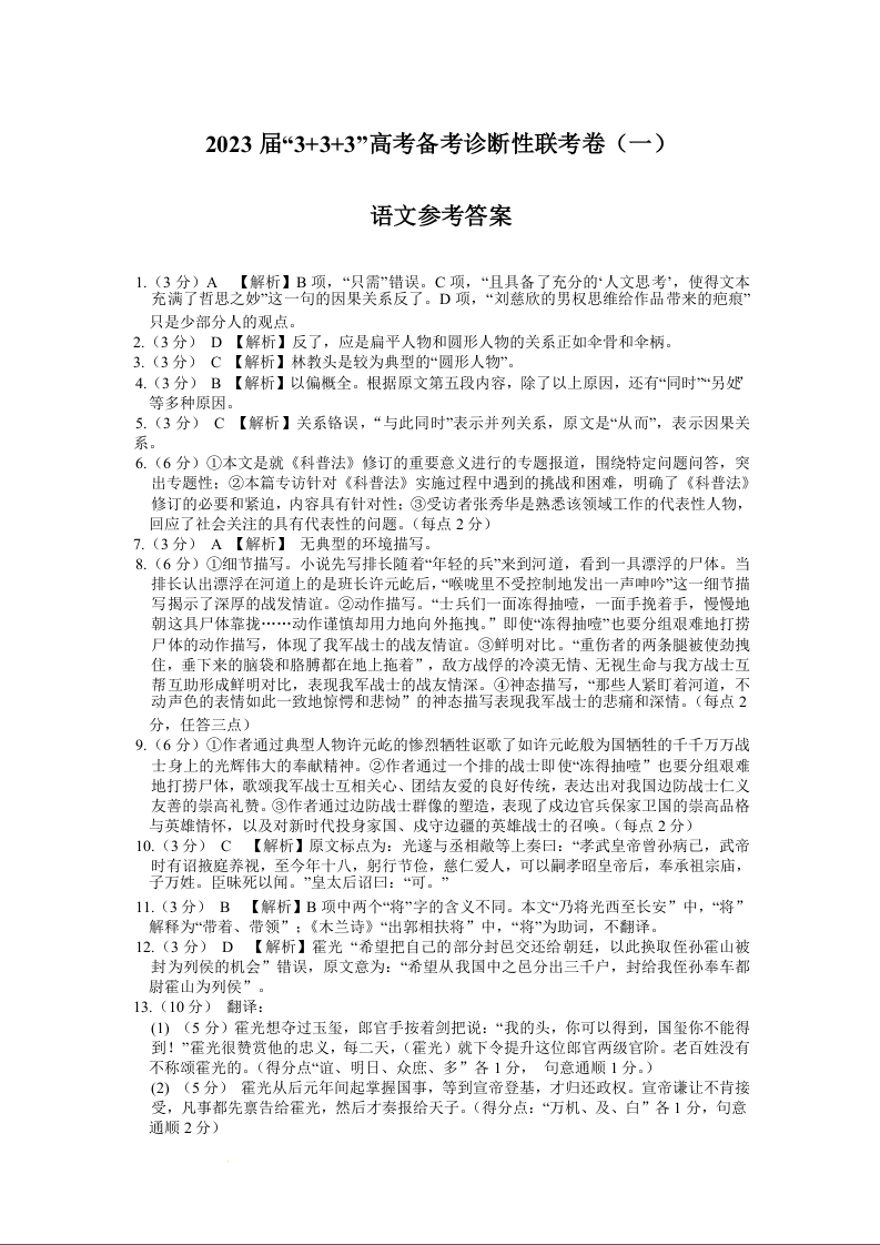 高三语文答案--贵州省2023届3+3+3高考备考诊断性联考(一)
