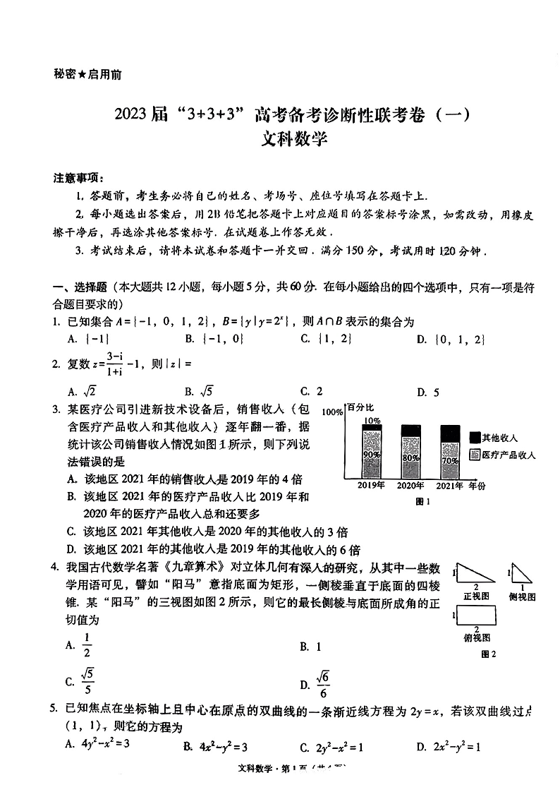 高三文科数学--贵州省2023届3+3+3高考备考诊断性联考(一)