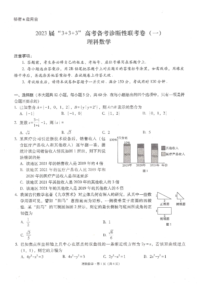 高三理科数学+答案--贵州省2023届3+3+3高考备考诊断性联考(一)