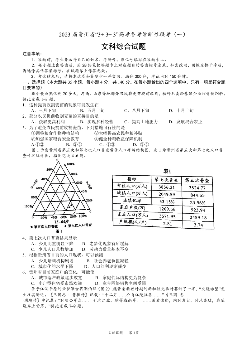高三文科综合+答案--贵州省2023届3+3+3高考备考诊断性联考(一)