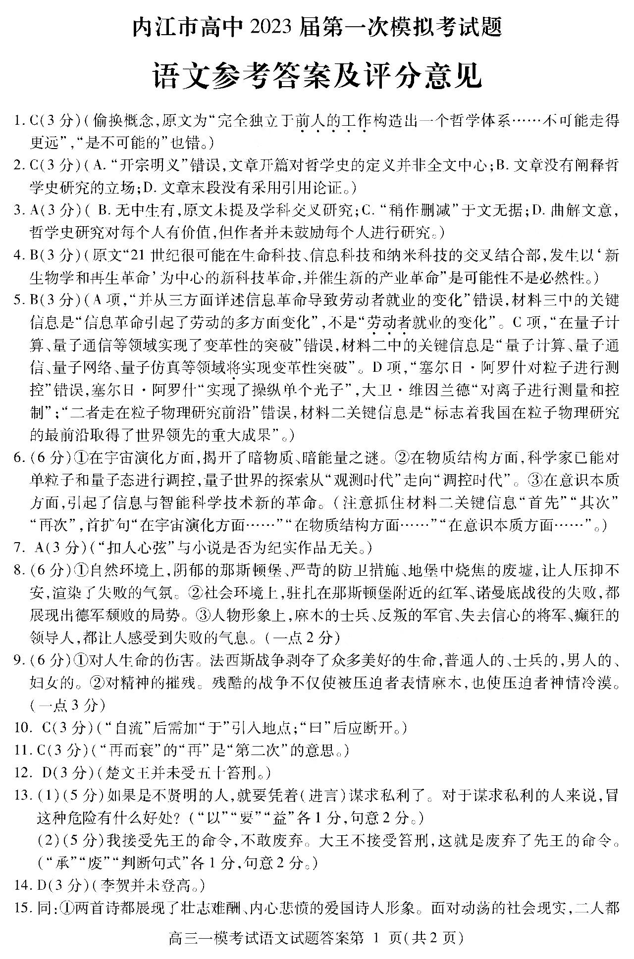 高三语文答案--四川省内江市2023届高三第一次模拟考试