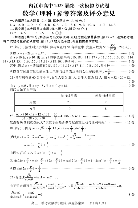 高三理数答案--四川省内江市2023届高三第一次模拟考试