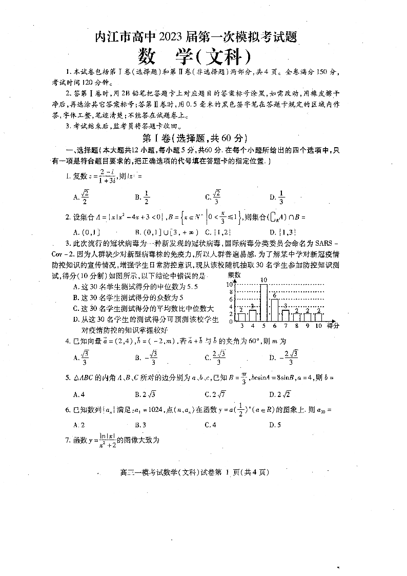高三文数--四川省内江市2023届高三第一次模拟考试