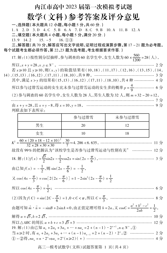 高三文数答案--四川省内江市2023届高三第一次模拟考试