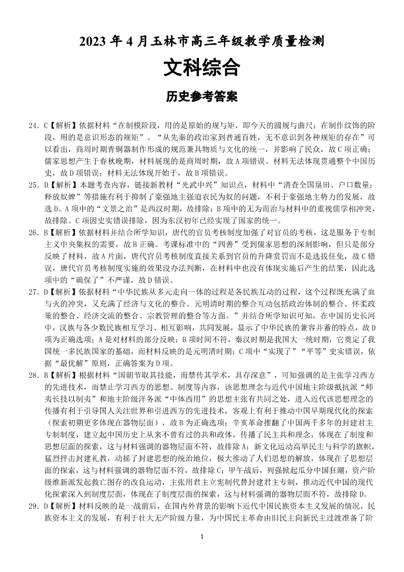 高三文综历史答案--广西壮族自治区玉林市2023届高三下学期三模