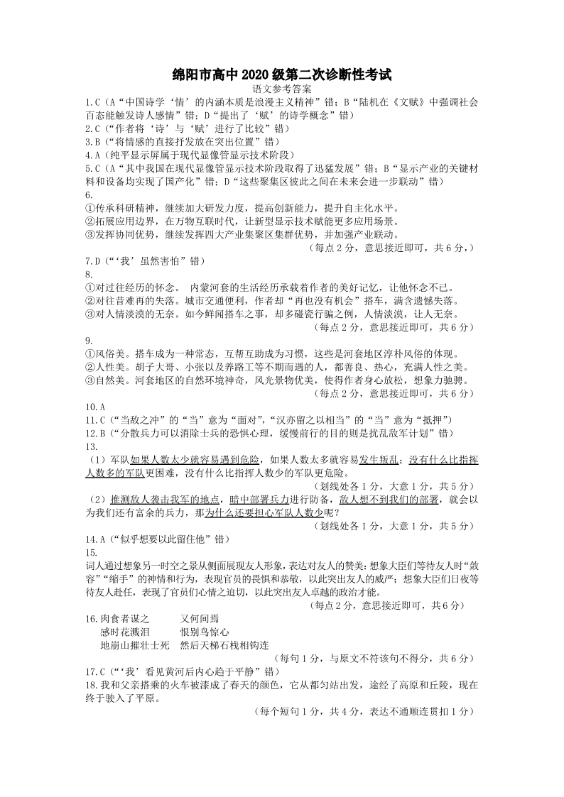 高三语文答案--四川省绵阳市2023届高三第二次诊断性考试
