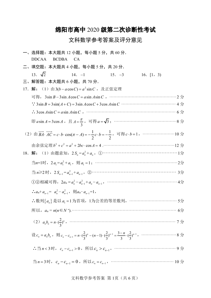 高三文科数学答案--四川省绵阳市2023届高三第二次诊断性考试