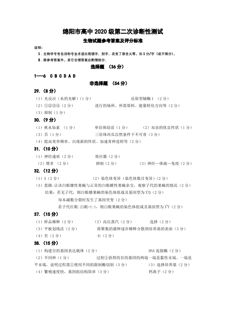 高三理科综合答案--四川省绵阳市2023届高三第二次诊断性考试