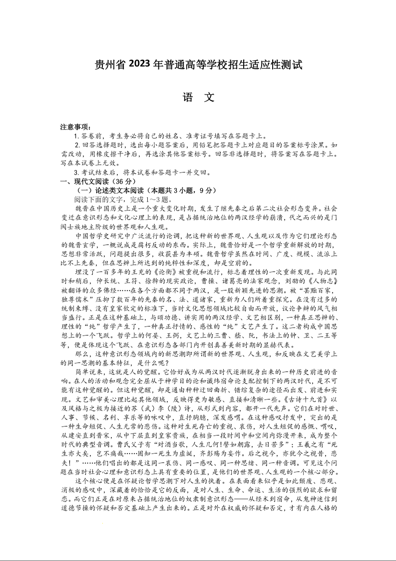 高三语文--贵州省 2023 年普通高等学校招生适应性测试