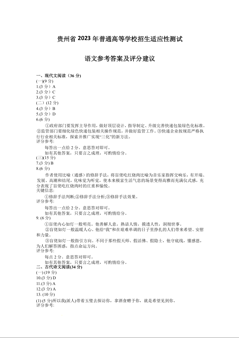 高三语文答案--贵州省 2023 年普通高等学校招生适应性测试