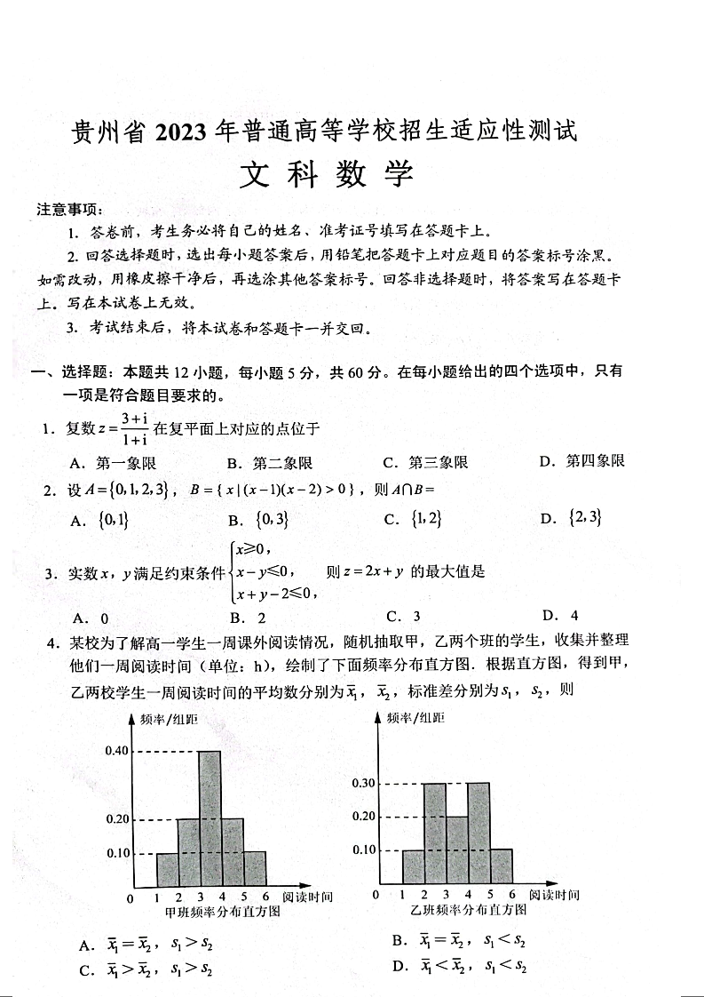 高三文数--贵州省 2023 年普通高等学校招生适应性测试
