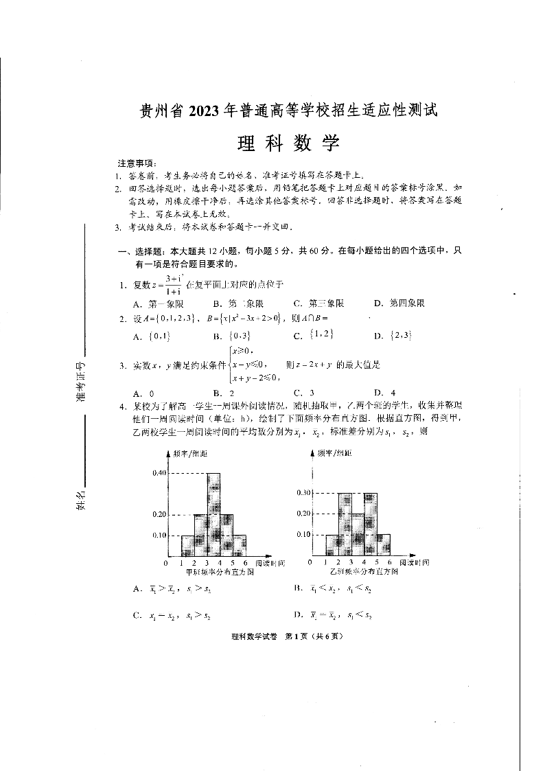 高三理数--贵州省 2023 年普通高等学校招生适应性测试