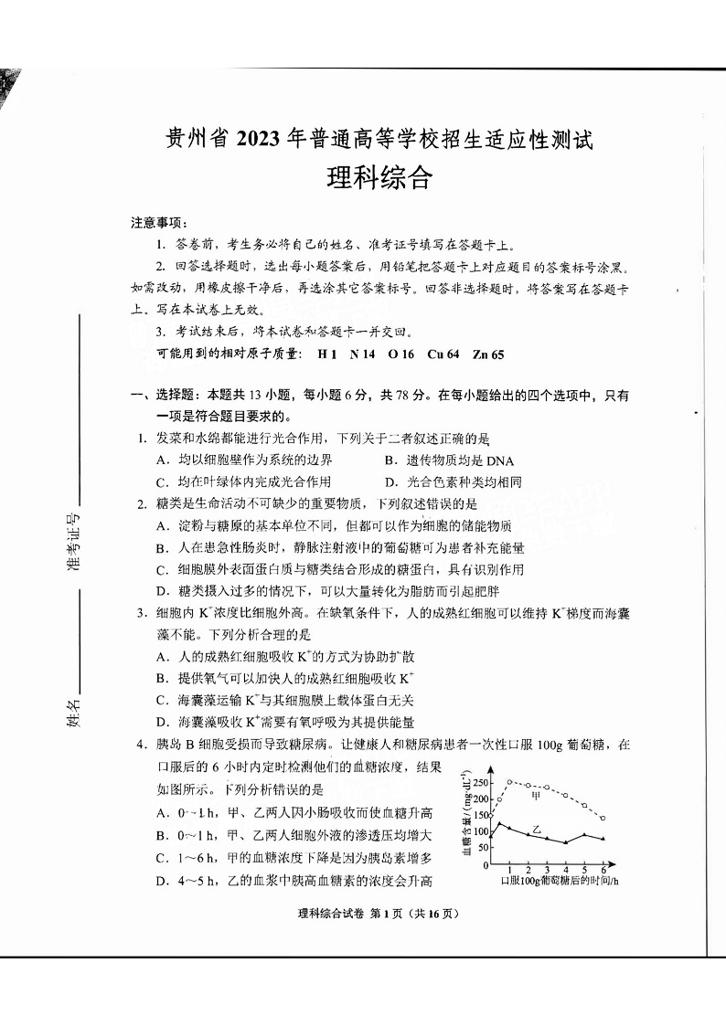 高三理综+答案--贵州省 2023 年普通高等学校招生适应性测试