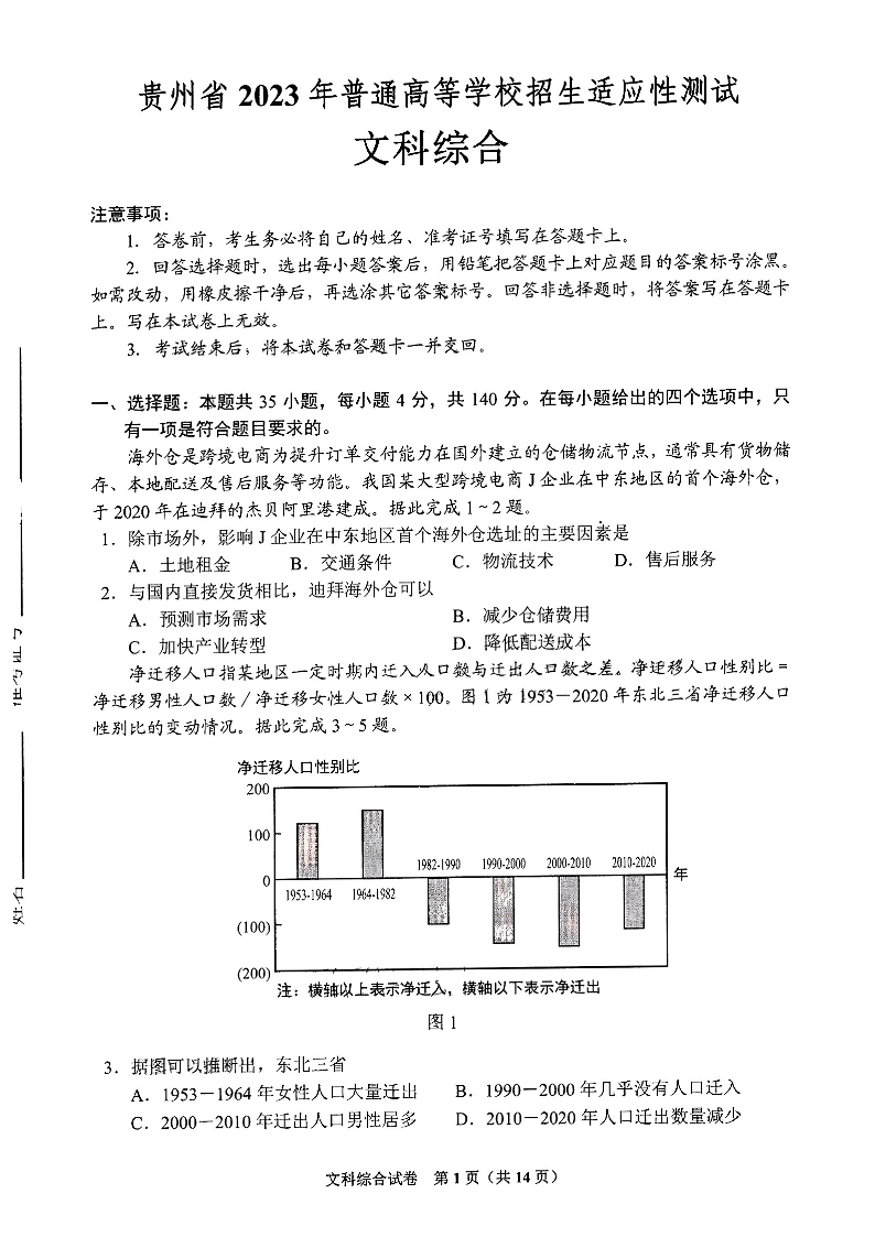 高三文综+答案--贵州省 2023 年普通高等学校招生适应性测试