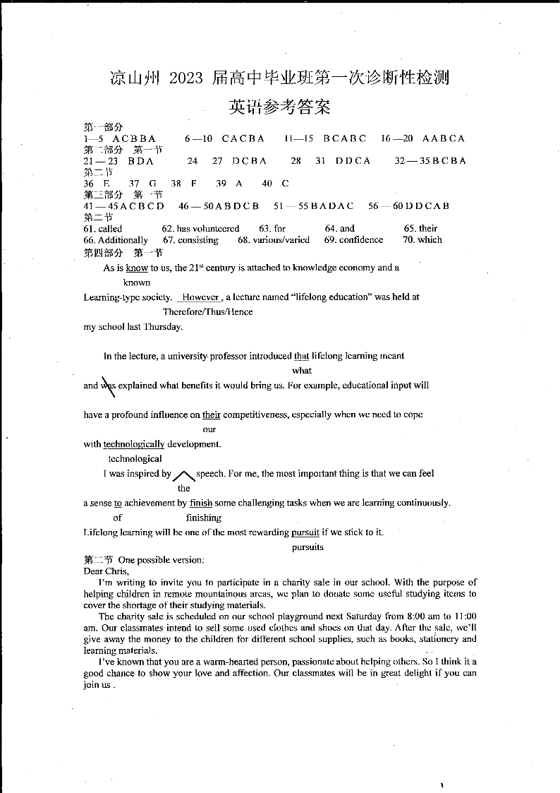 高三英语答案--四川省凉山州高中毕业班第一次诊断性检测