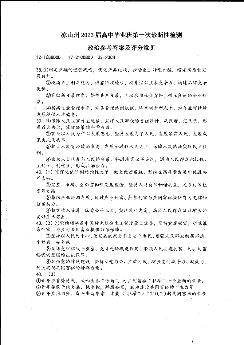 高三文综答案--四川省凉山州高中毕业班第一次诊断性检测