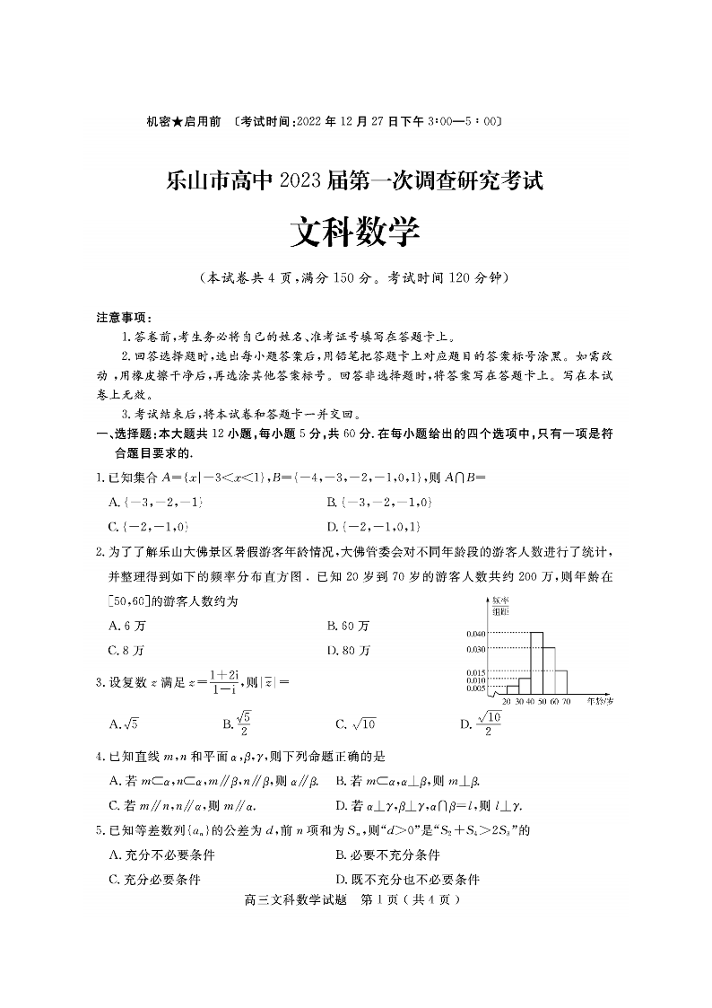 高三文数--四川省乐山市2023届高三第一次调查研究考试