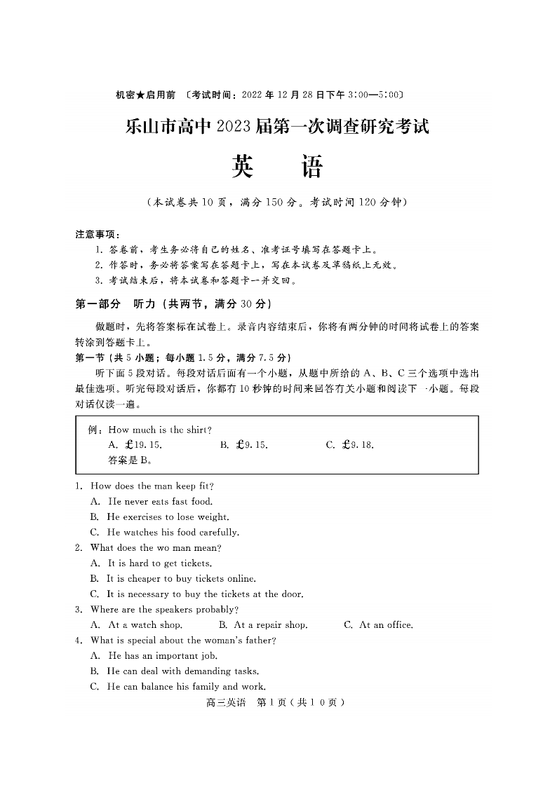 高三英语--四川省乐山市2023届高三第一次调查研究考试