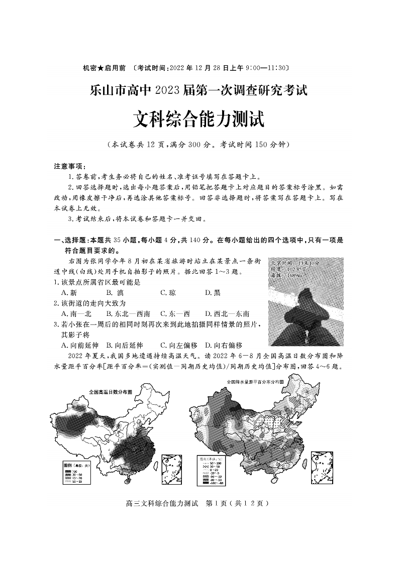 高三文综--四川省乐山市2023届高三第一次调查研究考试