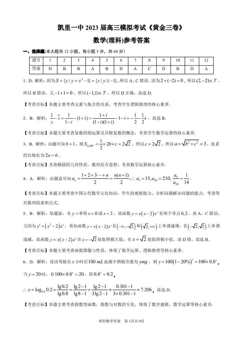 高三理数答案--贵州省凯里市第一中学2023届高三三模