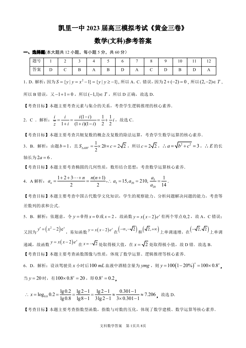 高三文数答案--贵州省凯里市第一中学2023届高三三模