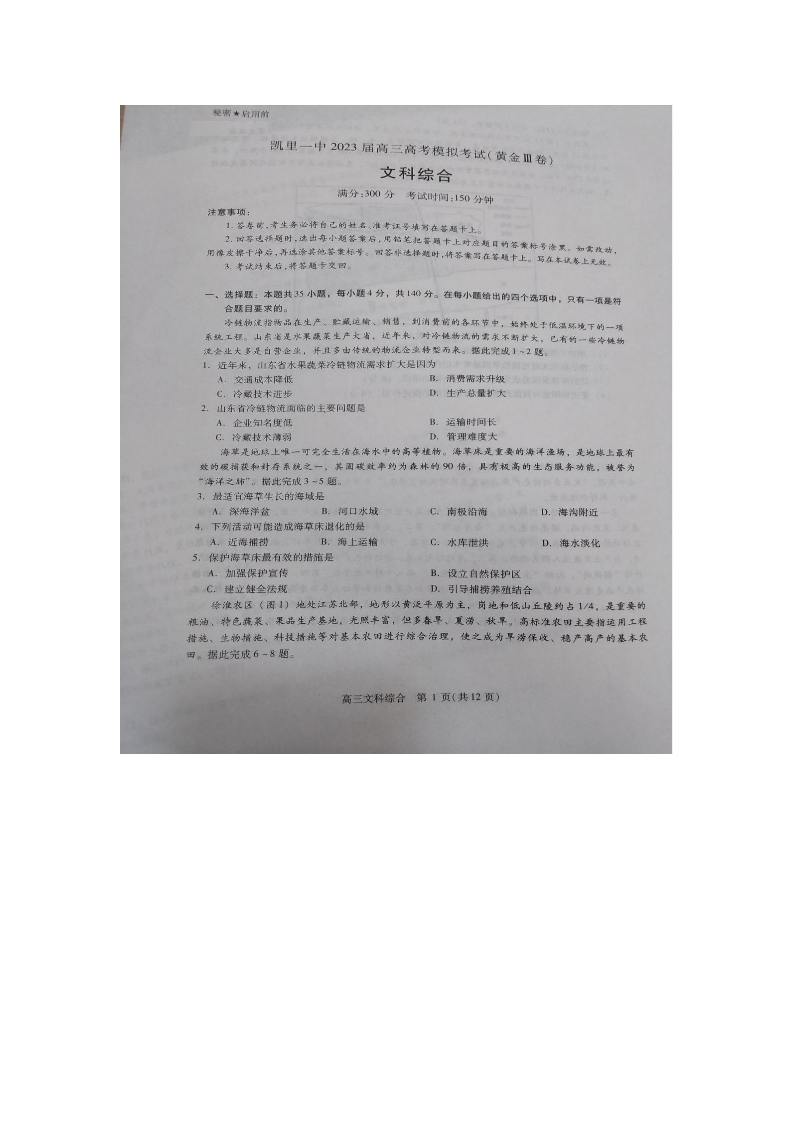 高三文综--贵州省凯里市第一中学2023届高三三模