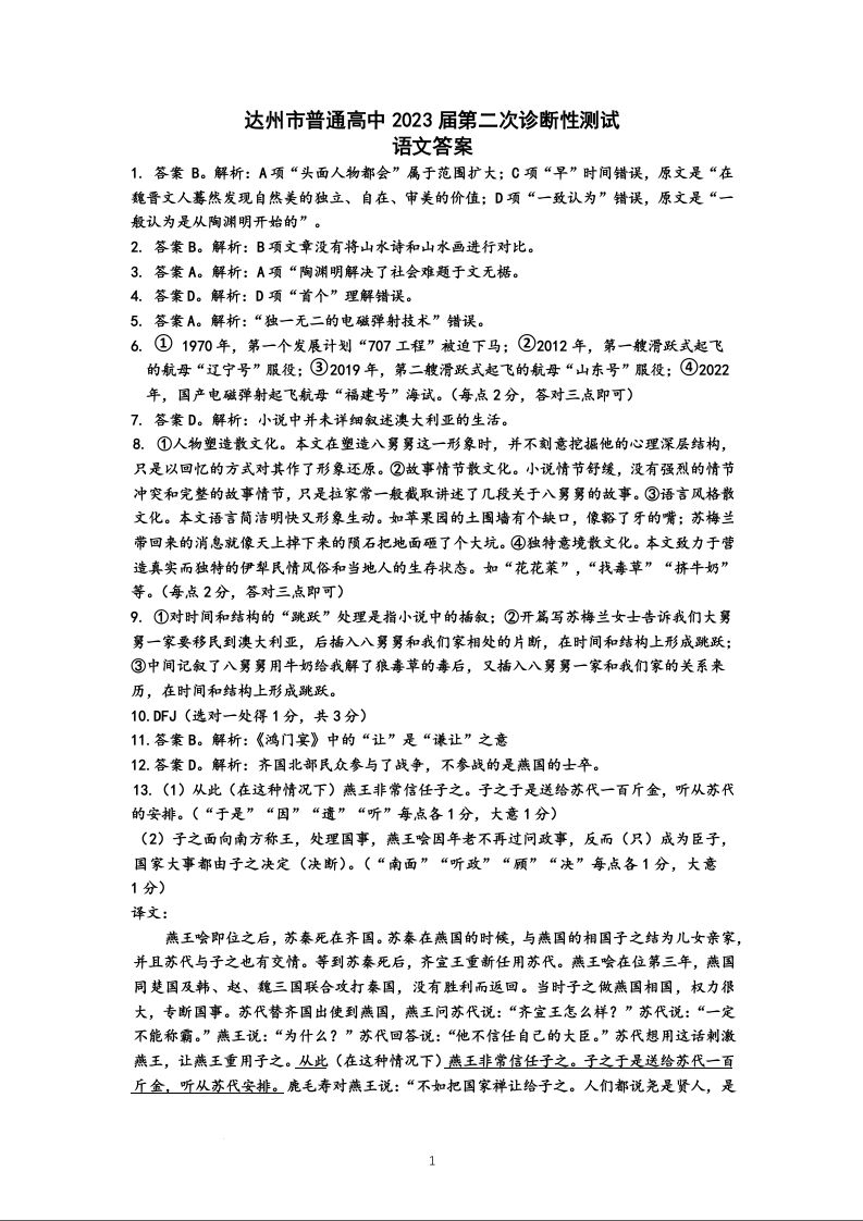 高三语文答案--四川省达州市2023届高三下学期第二次诊断性测试